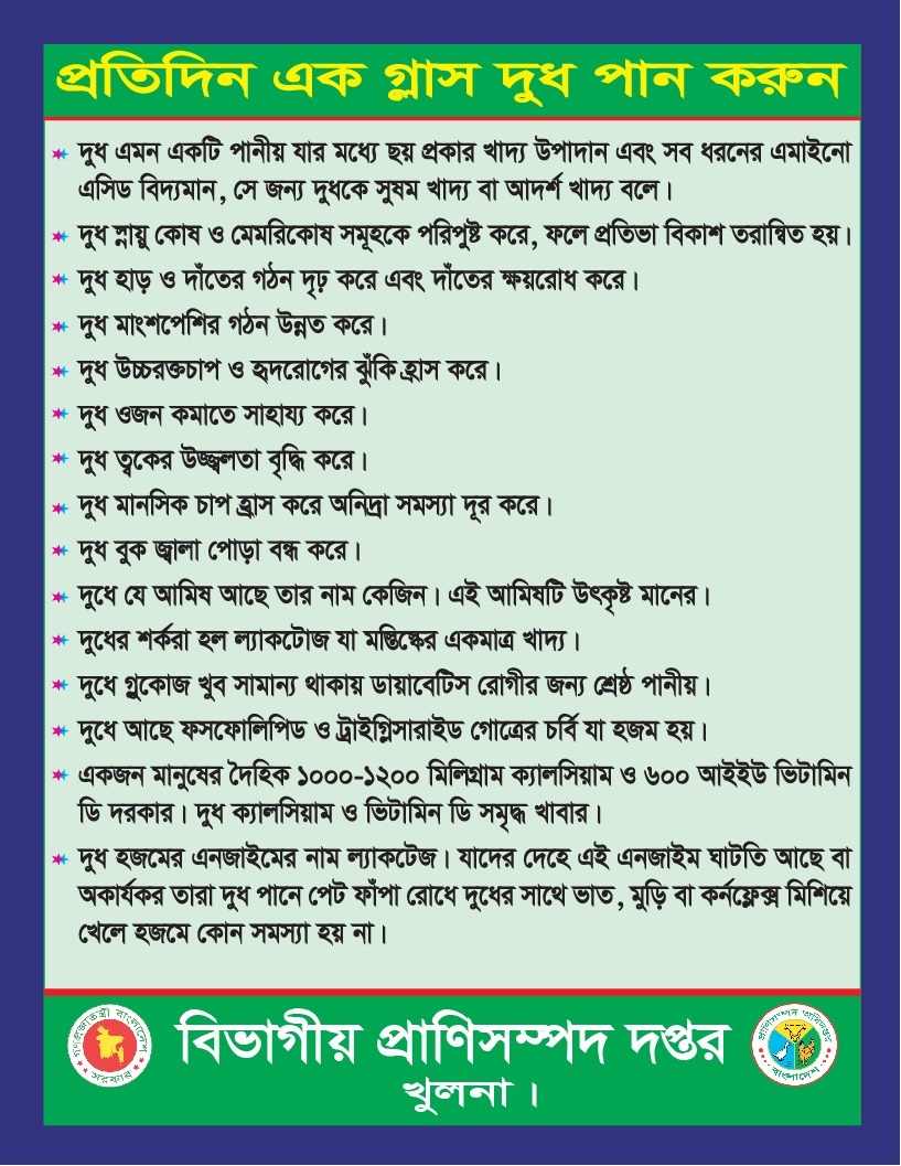 | ৪ | প্রতিদিন এক গ্লাস দুধ পান করুন, প্রচারে: বিভাগীয় প্রাণিসম্পদ দপ্তর, খুলনা। | | | ০৮-০১-২০২৬ | দেখুন |